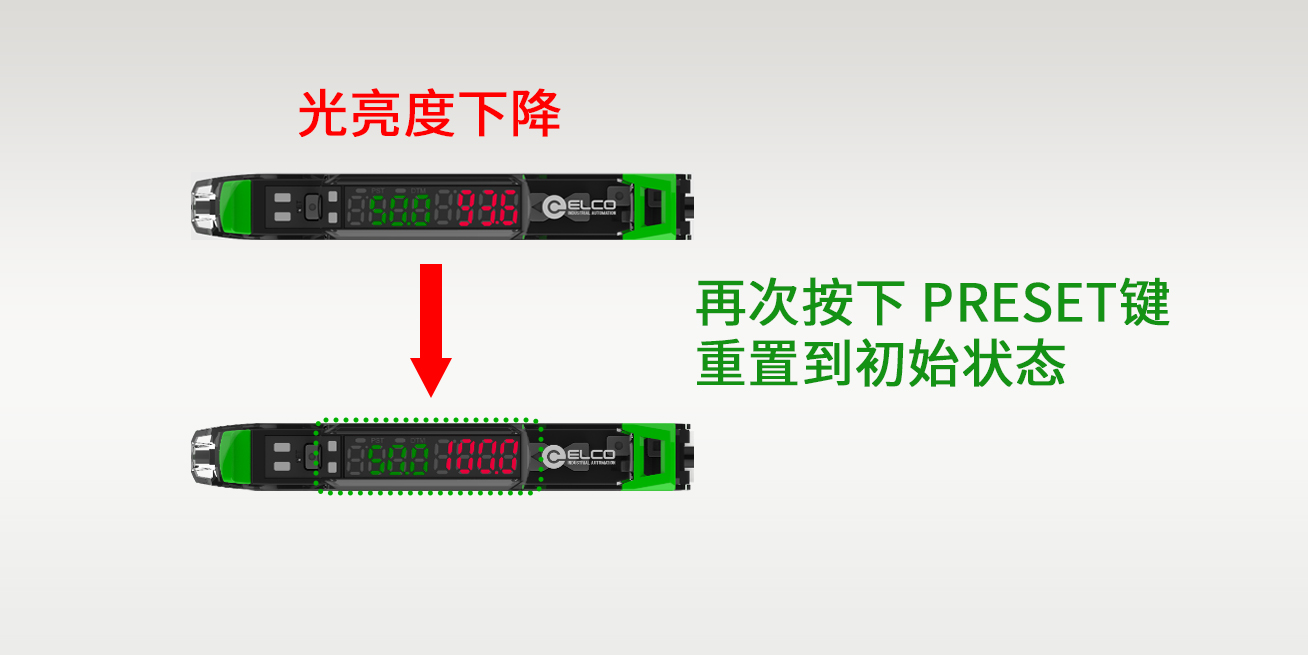一鍵預(yù)設(shè)值功能:多個傳感器級聯(lián)使用,只需一鍵即可完成設(shè)置,按PRESET 按鈕一次即可同時設(shè)置靈敏度并將顯示值重置為100。使用多個傳感器時預(yù)設(shè)功能的作用更加突出,輕松快速地找到變臟或偏移的傳感器。只需按下主單元上的 PRESET 鍵即可完成一鍵式復(fù)位