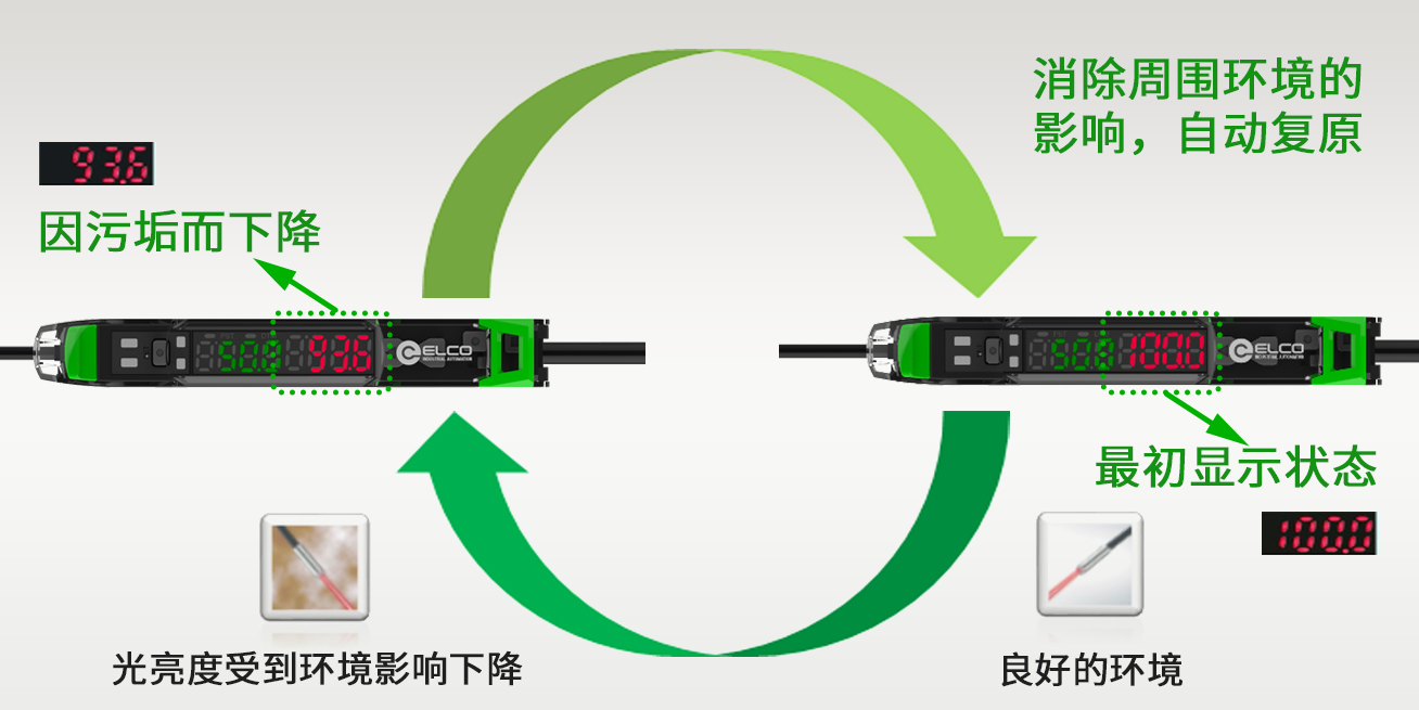 自動維護功能——DATUM:自動維護功能可察覺光亮度因污垢或其他原因而下降,并將傳感器復(fù)原到最初的顯示狀態(tài)。 該功能可消除周圍環(huán)境的影響,使傳感器能夠持續(xù)進行高精度檢測